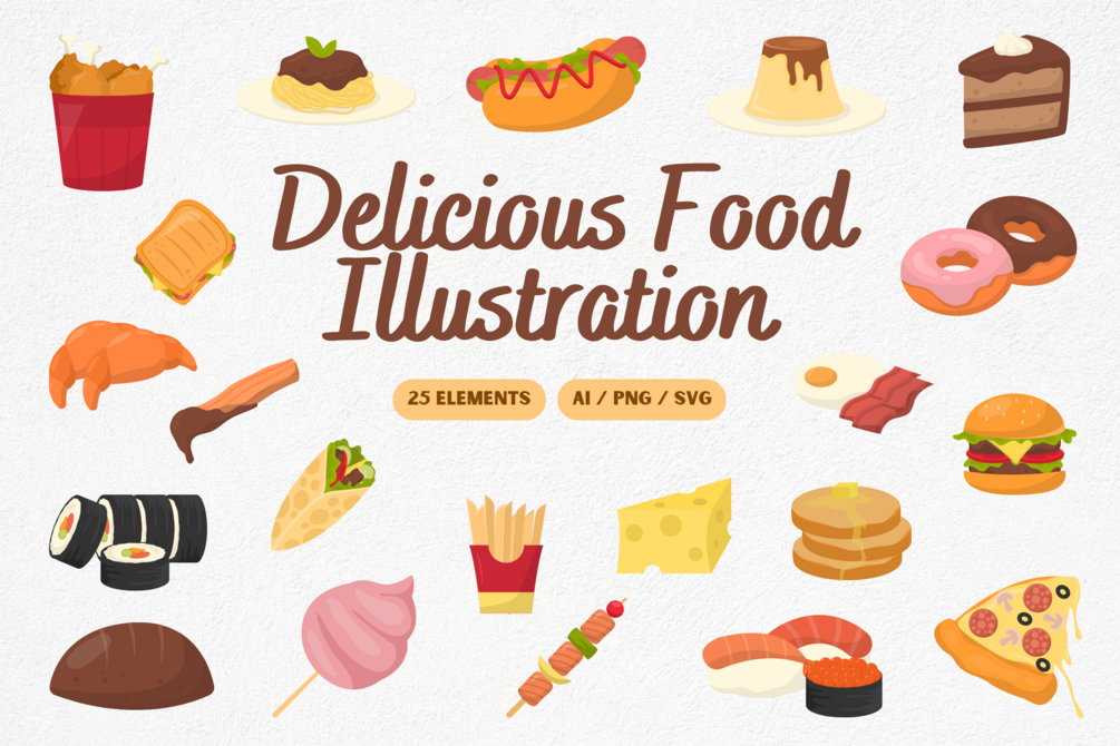 Give your designs a blast with these delicious food illustrations! This collection comprises 25 illustrations of so many kinds of tasty food. From sweet desserts to yummy sushi. All these elements are perfectly crafted for your projects. You can customize the colors and make a difference.